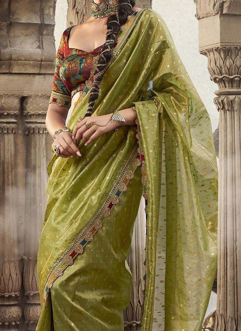 - This pista green tissue saree is crafted with fine jacquard weaving enriched with traditional zari work. The fabric has a soft sheen that reflects light beautifully while maintaining a lightweight drape for all day comfort. The embroidered sequins along the border add a touch of shimmer and elegance making the saree perfect for festive occasions. The lace edging frames the saree neatly accentuating its refined detailing. This harmonious blend of pista green and olive green tones makes it a refreshing choice for both daytime and evening celebrations.