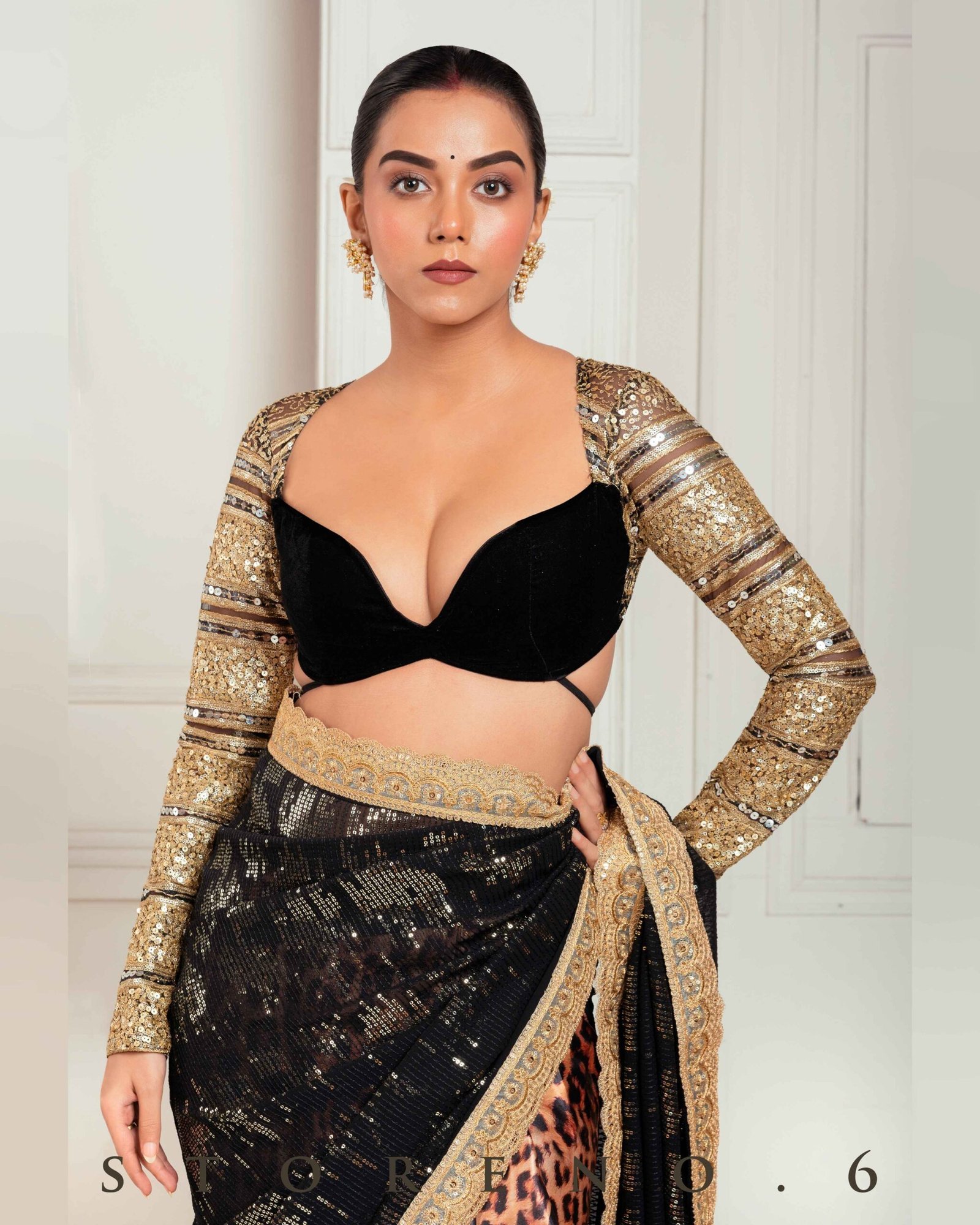 Half And Half Full Sleeve Blouse With Zari nd Sequins Embroidered Black Net and Velvet.